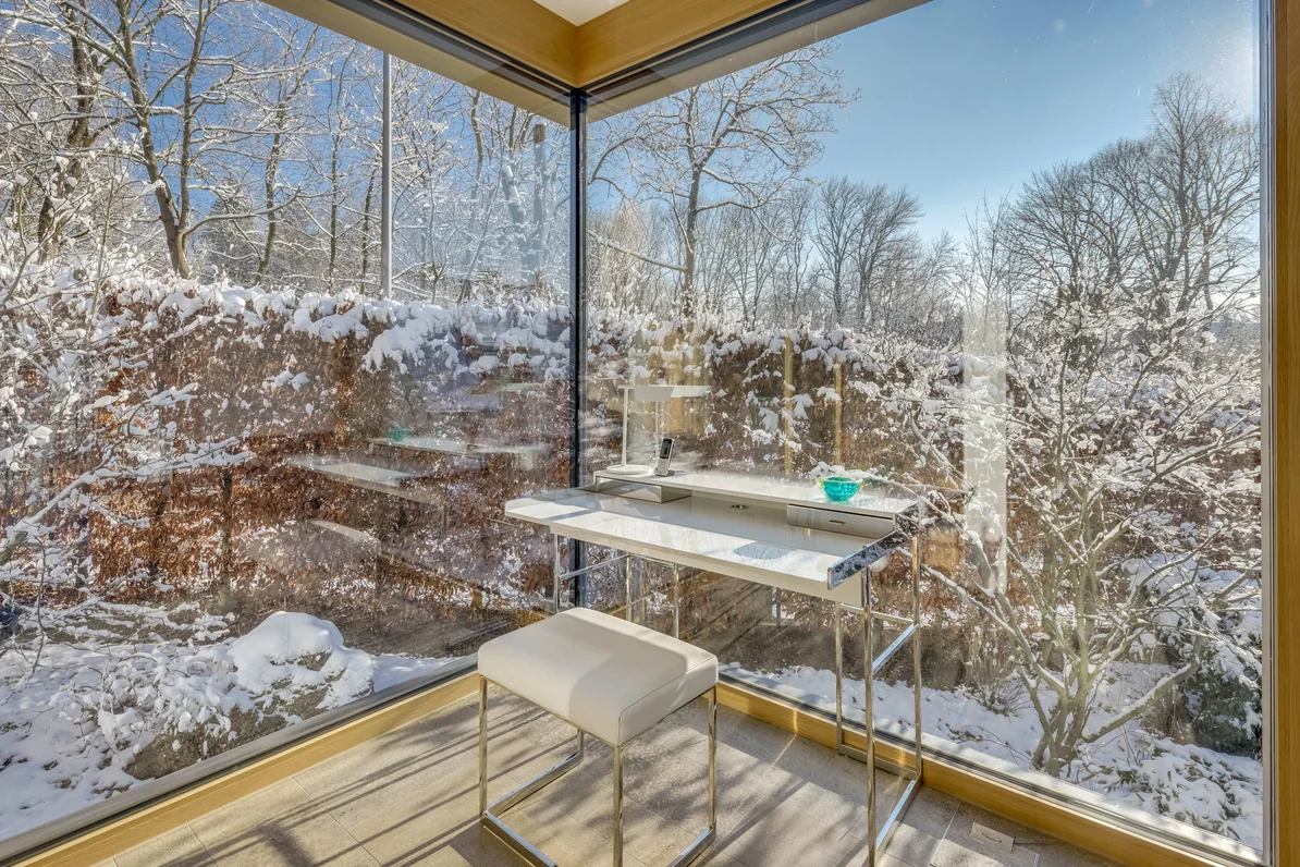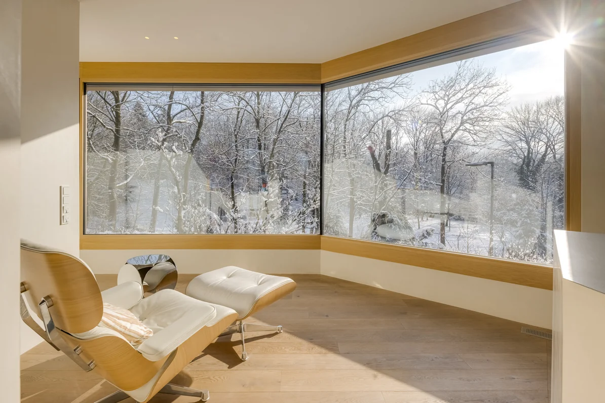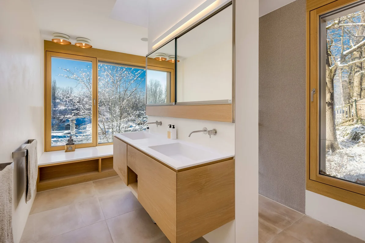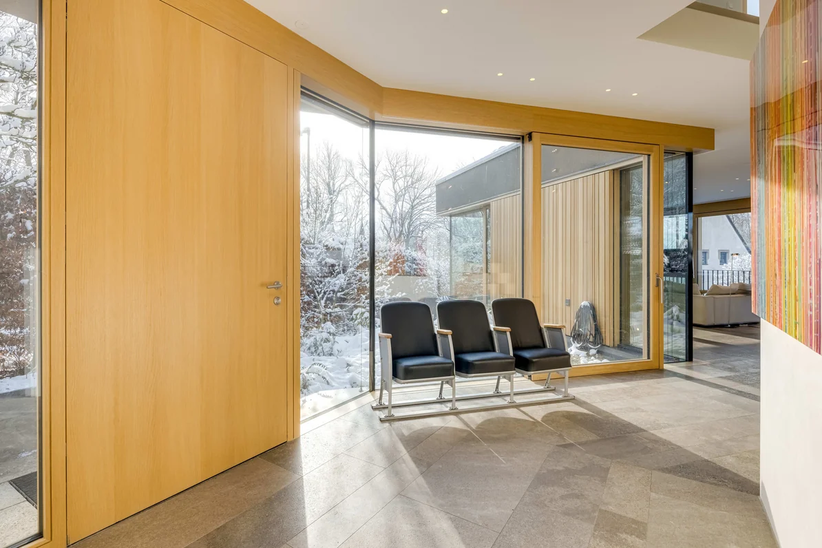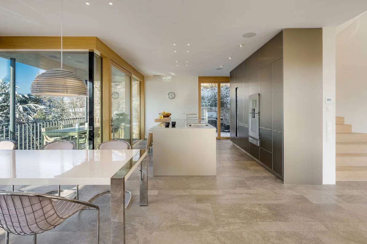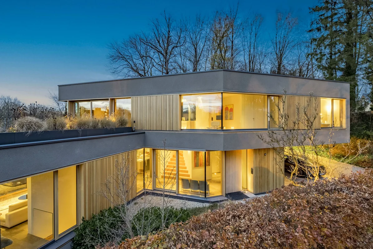 A clear, modern design language, a luxurious interior design with precious natural materials and a successful, family-friendly spatial concept characterize this absolutely top-class property. The façade lives from the effective interplay of large-format glass fronts and closed surfaces; vertical oak elements establish the connection to the idyllic, natural location. A cantilever lends lightness and a floating effect to the cubically inspired structure.